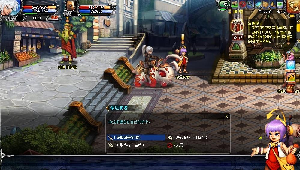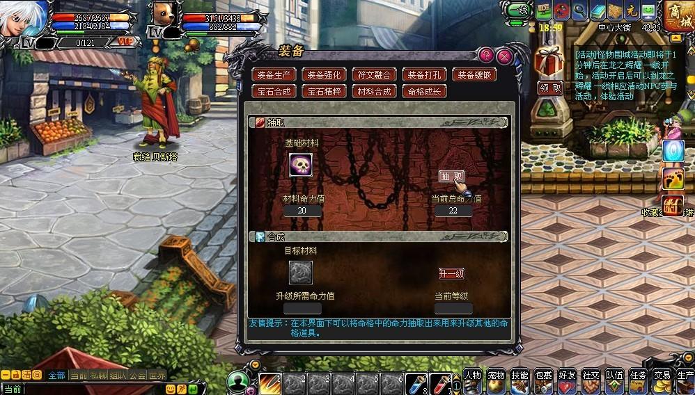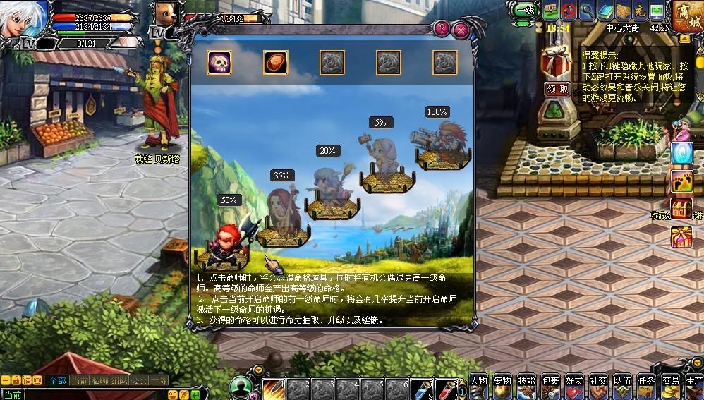通过中心大街(44,22)处的NPC命运使者即可打开命格获取界面,点击已亮的仙人即可随机获得一个命格道具。不同的命格拥有不同的附加属性。同时,仙人算命师将会有一定的几率偶遇下一级的仙人。