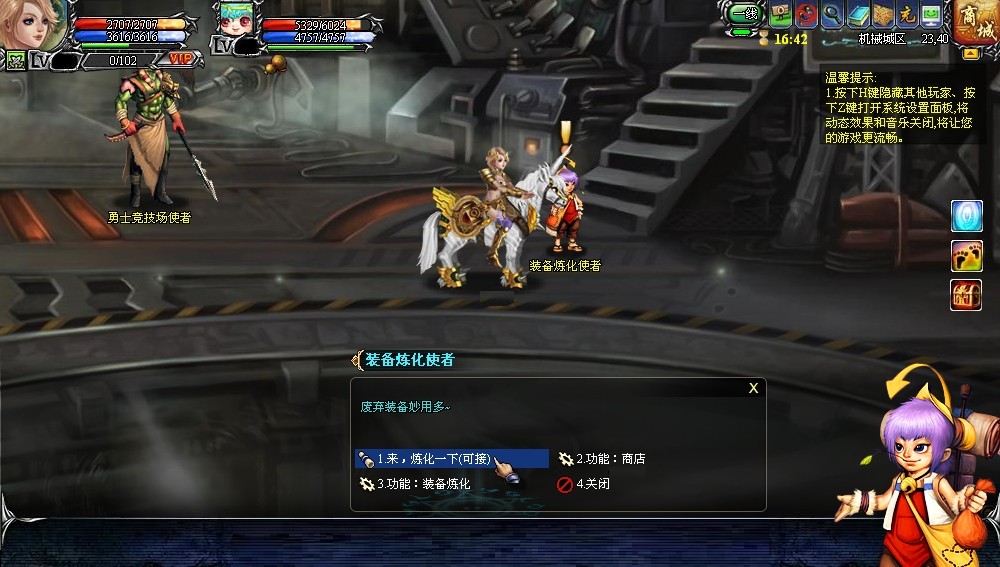 角色可以在机械城区(24,38)与NPC装备炼化使者对话,使用装备炼化功能。装备炼化功能中包含装备炼化和属性升华两个子功能。