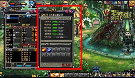 宠物技能界面主要包括宠物资质和宠物技能栏。宠物资质可充分的显示出当前宠物的各项资质点状况。宠物技能栏目前默认可存放宠物获得的技能为4个,宠物进化度每提升2级,可自动激活一个技能格,宠物的技能最多为12个。如果不想使宠物拥有现有的某项技能,可以通过遗忘道具进行该技能的遗忘。