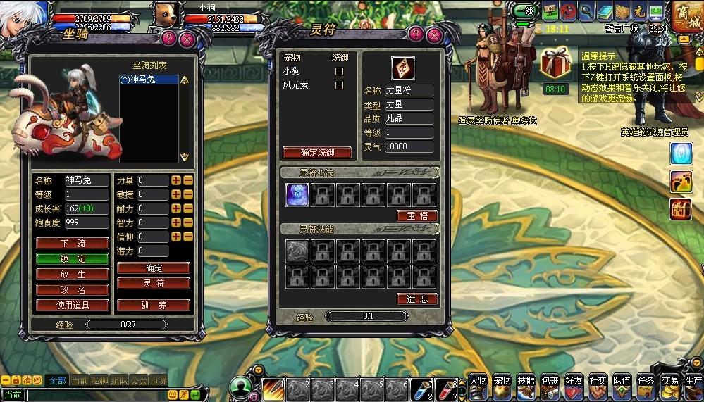 灵符:点击“灵符”按钮,即可弹出灵符界面。在灵符界面,可以查看骑宠已装备的灵符道具、该骑宠统御的宠物、灵符心法以及灵符技能等相关信息。