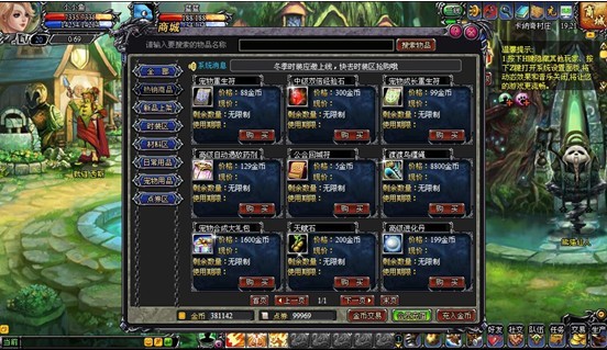 通过“搜索物品”可以快速查找到自己想要买的物品,商城界面会显示出商品的外观、价格、现价、剩余数量、使用期限。如有打折,则会显示“原价”和“现价”,并标明打折比率。
