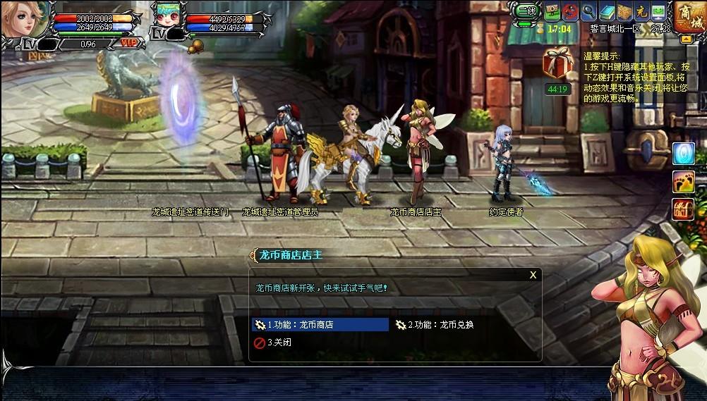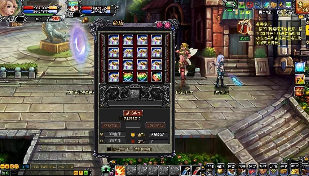 与誓言城北一区(27,29)的NPC龙币商店店主对话可以打开龙币商店页面,点击“试试手气”即可开始一次抽奖过程,可自行选择兑换一定数额的龙币或是从指定的道具中随机抽取一个道具。每次抽取道具需要消耗200金币或是400龙币。