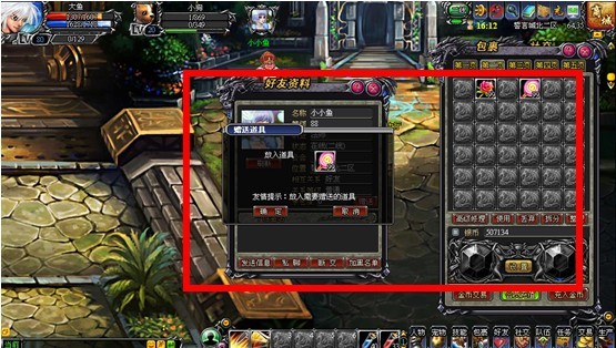 点击赠送按钮,会弹出包裹里可赠送的道具,拖入进需赠送的物品道具栏,点击确定按钮,可将此道具赠送给对方并增加与其的亲密度。