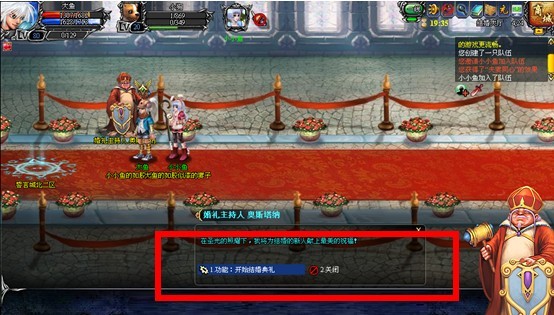 在结婚大厅找到婚礼主持人 奥斯塔纳,选择“开始结婚典礼”,方可开启浪漫而又经典的龙之刃皇家婚礼仪式。