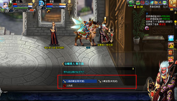 在宝藏猎人 斯文森处接领藏宝图和高级藏宝洞任务,会得到“藏宝猎人的指引”和“高级藏宝图”道具,使用“藏宝猎人的指引”后会得到“宝藏猎人追缉令”。根据指引完成指定地图杀死暗雷怪物的任务后,可获得经验、金钱和藏宝图道具的奖励,每天可接取完成10次寻宝任务。高级藏宝洞任务可以直接获得1个高级藏宝图,双击左键使用高级藏宝图可以传送到高级藏宝洞副本。击杀宝藏主人可以获得宝箱钥匙,钥匙开启宝箱可以获得配方、宠物技能书等奖励。