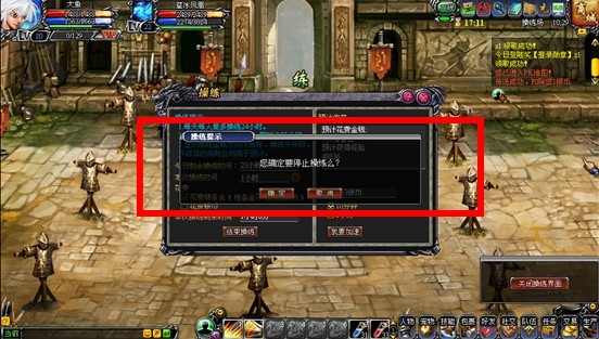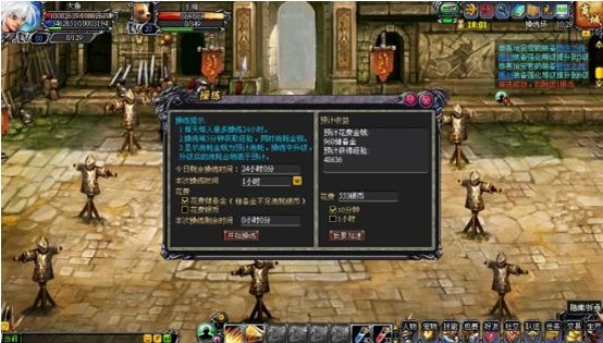 每人每天最多可操练24小时,当进行操练时,无法离开操练场,并且无法进行PK,切磋,交易等操作,每1分钟会获得相应的经验值,获得的经验值会在右上方系统消息处显示。操练花费费用每5分钟扣取1次,当银币不足扣除时,会停止操练。