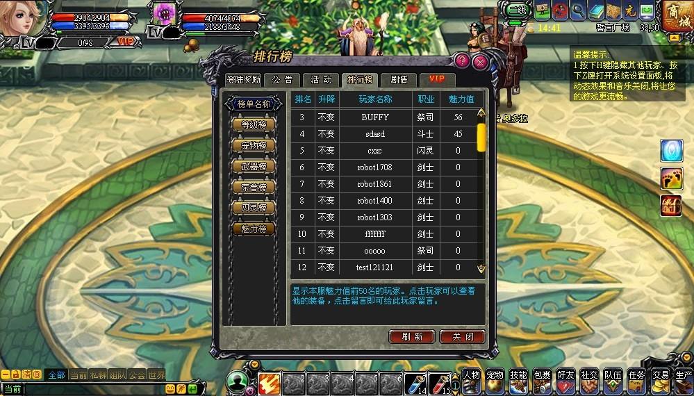 本服务器内魅力值前50名得玩家可以列入魅力榜,魅力榜前10名的玩家可以获得相应的荣誉称号。