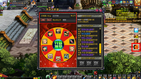 在游戏界面右侧活动指引下方能找到幸运转盘图标,玩家每天可领取10000点幸运币。每次抽奖消耗5000幸运币,幸运币可以用金币或者金券购买。