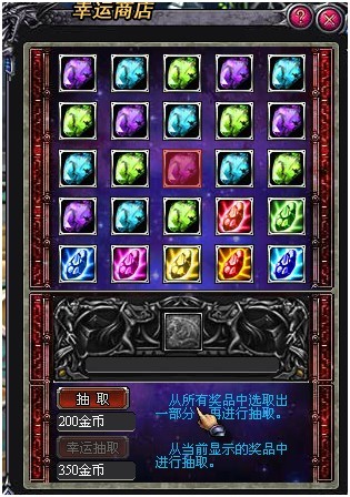 2.抽奖分为“抽取”和“幸运抽取”,“抽取”是在整体50个道具里面进行随机抽奖,“幸运抽取”是在显示面板的25个里面进行抽取。