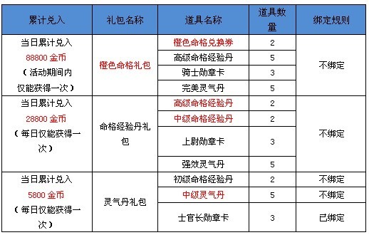 2、例如玩家在活动期间内单日(0:00-23:59)累计兑入88800以上金币的可以获得一个橙色命格礼包、命格经验丹礼包、灵气丹礼包。活动期间内单日(0:00-23:59)累计兑入28800以上金币可以获得命格经验丹礼包、灵气丹礼包。活动期间内单日(0:00-23:59)累计兑入5800以上金币可以获得灵气丹礼包。