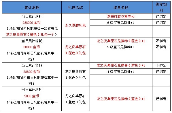 2、例如玩家在活动期间内单日(0:00-23:59)累计花费288000以上金币的可以获得一个永久夏装礼包、龙之庆典原石(橙色)礼包。活动期间内单日(0:00-23:59)累计花费 88800可以获得龙之庆典原石(橙色)礼包。活动期间内单日(0:00-23:59)累计花费28800可以获得龙之庆典原石(紫色)礼包。活动期间内单日(0:00-23:59)累计花费5800以上金币可以获得龙之庆典原石(蓝色)礼包。