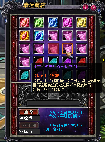 2.抽奖分为“抽取”和“幸运抽取”,“抽取”是在整体50个道具里面进行随机抽奖,“幸运抽取”是在显示面板的25个里面进行抽取。