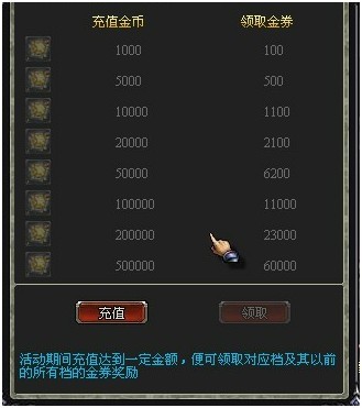3.累计兑入金币达到档次将可以领取返利金券。
