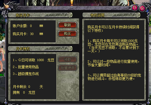 1、 游戏主界面右上角有月卡功能入口,点击进去可以花30mm购买月卡功能,从购买之日起连续30天可以每天领取1000龙豆和1个月卡勋章。还将拥有批量使用道具和跨级带宠物的特权,也就是说30MM=30000龙豆+30个月卡勋章,奖励限当天领取,龙豆等同于金券的价值,可用来购买道具,月卡勋章后面也可以兑换道具。