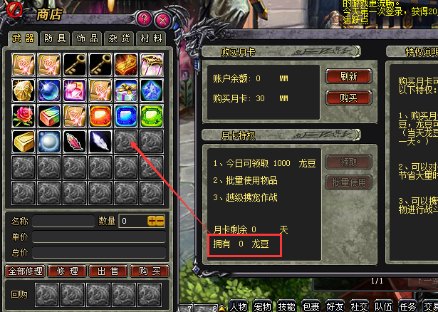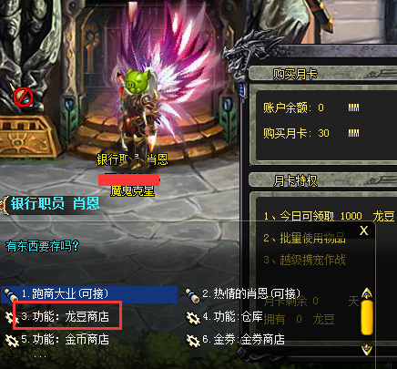 2、 在誓言城银行职员处有龙豆商店,可以利用月卡获得的龙豆购买道具,购买的道具为绑定不可交易。龙豆商店物品等同于商城价值,且会不定期更新道具种类。